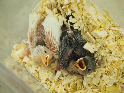 文鳥さんのヒナ。白と桜と1羽ずつ。