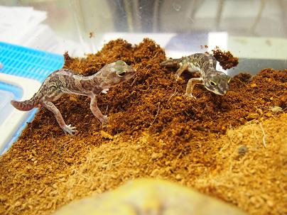 これはまったくの余談ですが、この東アフリカトカゲモドキをメガネ君と眺めながら、色々メガネ君の語りを聞いていた時に、メガネ君が「この黒っぽい方がオスですね」と言うので、「へー、オスは黒いんだ」と私が言ったところ、メガネ君が「いえ、この黒っぽいやつの方はキンタマが膨らんでますよね?そこで分かるんです。」と・・・。