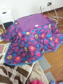この商品の箱にしっかり書いてあったのに私は見落としていたんですが、このコタツ、中に潜らなくても上に乗るだけでも温かいんですね。妻の方が箱をちゃんと見ていて、恥ずかしながら妻にそのことを教えて貰っちゃいました