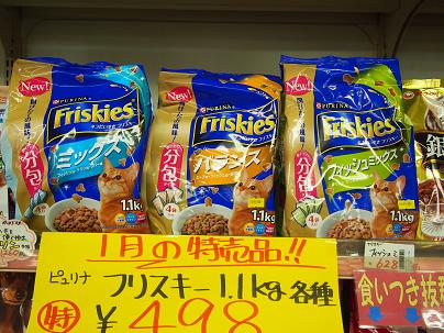 キャットフード「フリスキー 1.1kg」各種 特価!! ¥498!!