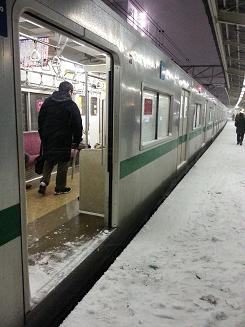 ?と心配になり、ちょうど前から駅員さんが歩いて来たので、「乗れないんですか?」と聞いてみたら、吹雪がすごいので最後尾車両の一番後ろのドア1枚だけ開いてますとのこと。