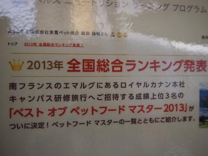 それは何かと言いますとね、このロイヤルカナン社からペットフードマスターの認定を受けたペットショップのスタッフというのは、全国にそれはそれは沢山おられる訳ですけどね、その大勢いるペットフードマスターの中で、数々の試験の合計点数とフードの販売数で競いまして、上位3位までに入るとその3名は「ベストオブマスター」として表彰して貰えるそうなんですよ。