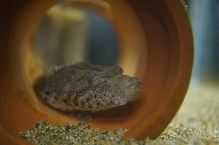 隠れ型のフグで用事が無いときには細かい砂の中に潜って目だけきょろきょろしてます。