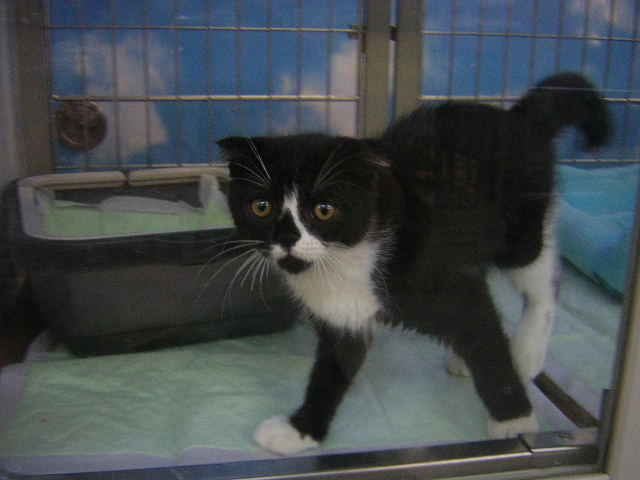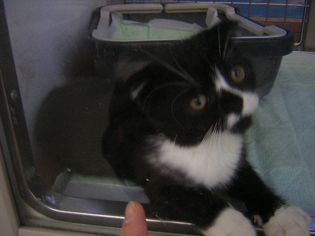 前に折れているお耳が特徴の「スコティッシュ・フォールド」という種類の猫ちゃんです。男の子ちゃんです。(中央下部に写っているのは、私の大切な人差し指です)