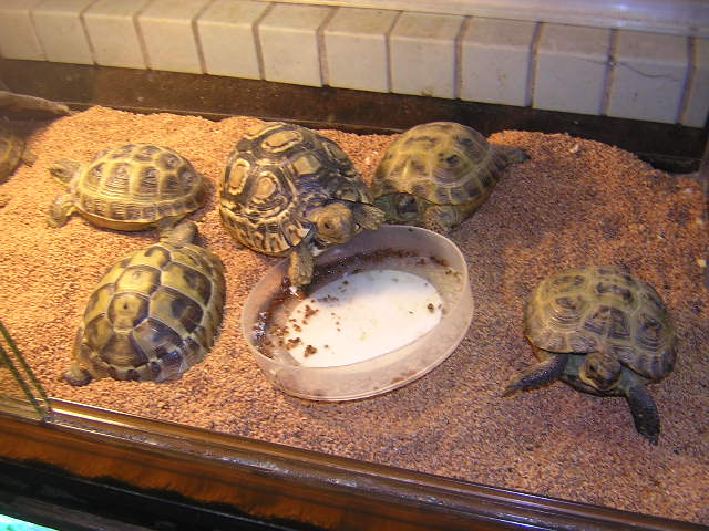 お皿に乗っかろうとしているのが、「ヒョウモンリクガメ」。左下が「ヘルマンリクガメ」