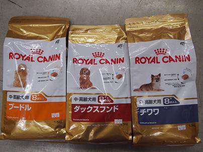 ロイヤルカナン社 犬種別フード 8歳以上のプードル用・8歳以上のダックス用・8歳以上のチワワ用。