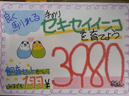 セキセイインコのヒナのお値段は、「ノーマルカラー」、「パイド」、「スパングル」など色によって違っていて、希少なカラーのこはお高めだったりするのですが、この「セット購入」でお買い上げ頂く場合はどのカラーのコであってもセットで¥3,980!!