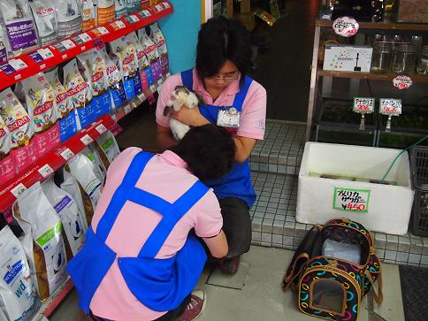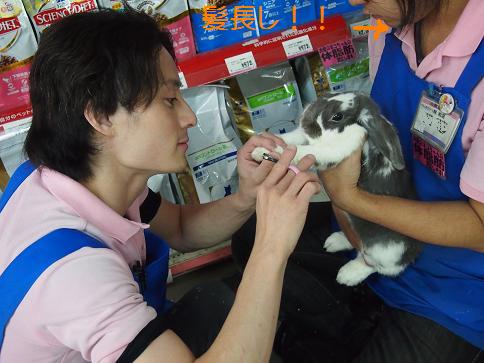 お客様のウサギさんの『爪切り』をやっているんですね。安全の為、必ず2人で行います。