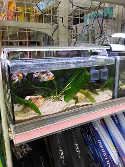 ”ブラックコーナー”がかなりシックなミリョクをかもし出してくれ、お魚の色や水草の緑が映えるんです。