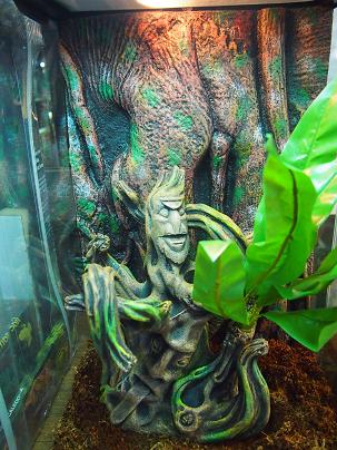 熱帯雨林の雰囲気をバリバリかもし出す、オーナメントや人工プランツ、そしてカッコイイバックグラウンド!!これもこのセットに入っております。その他温度計と湿度計も付いて、