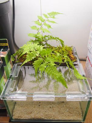 オリヅルランやプミラなどの観葉植物をおしゃれに植えるのも良いですが、私なんかは”ネイチャー思考”なんで、そんなおしゃれな水辺は自然には無いはず!って思い、メガネ君に「店の裏に生えてるシダ引っこ抜いて来て!!」とお願いし、