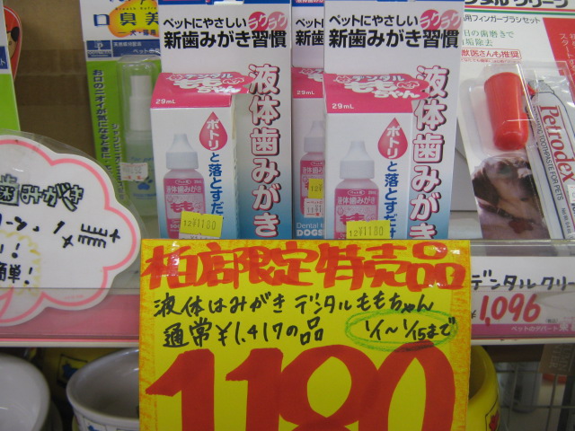 人気のワンちゃん用液体歯磨き。「デンタルももちゃん」通常¥1,417のところ、特価¥1,180!! (1月15日迄!)