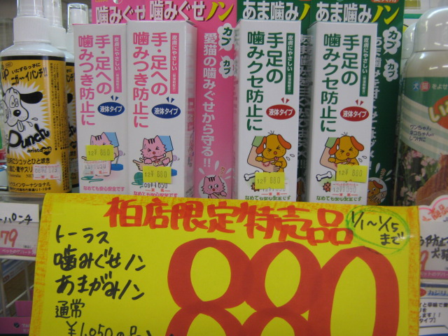 お家のワンちゃんが飼い主さんの手足に面白がって噛み付いてくるのを防止する「あま噛みノン」とネコちゃん用の「噛みぐせノン」。どちらも通常¥1,050のところ、特価¥880!! (1月15日迄!)