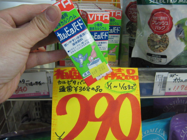 鳥さん用液体カルシウム&ビタミン剤「カルビタバード」。通常¥368のところ特価¥290!! (1月15日迄!)