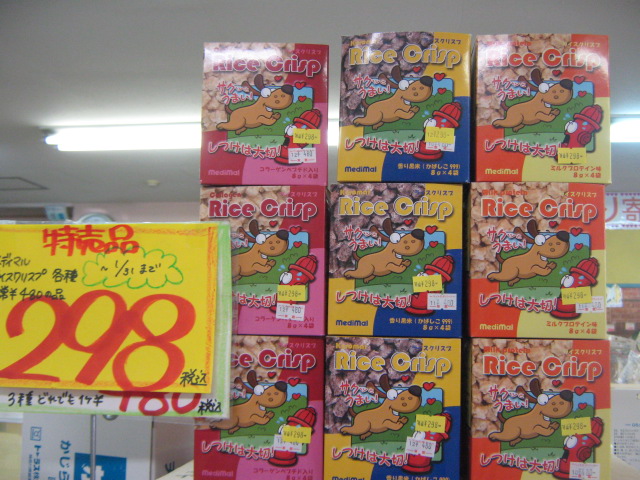 ちょっと前にこのブログで紹介いたしました、ワンちゃんの良く出来た時に与えるご褒美に一番オススメのおやつ「ライスクリスプ」!!通常¥480のところ、特価¥298!! (1月末日迄!)