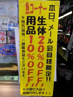 お魚コーナーの生き物(爬虫類・両生類・昆虫も含む)が表示価格より、にっ、20%OFF!!