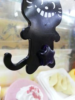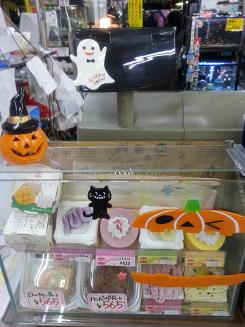 楽しく…と言えば、先日T主任が100円ショップで、ハロウィンの飾り付けを買ってきまして(←ビンボーなのに自腹で!)、ワンちゃん用ケーキの見本を飾っているケースを