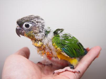 そして、前回アッ!という間にお家が決まってしまった、ワキコガネウロコメキシコインコのヒナちゃん。