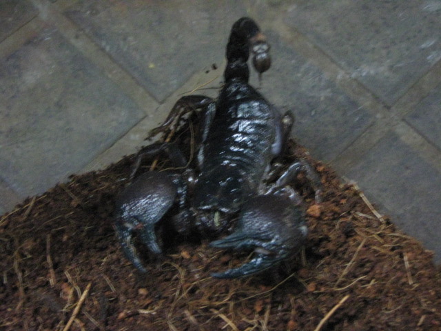 このサソリはもちろん「毒針」を持っているのですが、毒の強さは「アシナガバチ」位です。気を付けて飼育しましょう。