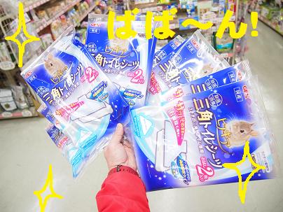 先日の特売品紹介で出て参りました人気商品!『三角トイレシーツ』の2枚入りを差し上げマース