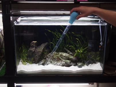 底にたまるちょっとしたゴミを取り除きたいだけっていう時に、大掛かりにバケツやホースを出してくるのはおっくうだし、小さな網ですくい取るのでも良いが、スポイトの方が手軽にスマートに出来る!