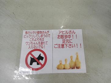 そうなんですよ、アヒルさんをお散歩させるようにしたので、このような注意書きを貼らせて頂きました。
