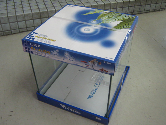 まず、こちら。30×30×30cm オールガラスキューブ型水槽。専用フタ受けとガラスブタ付きです。メーカー希望小売価格¥6,142の品。3,980円!!