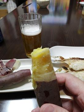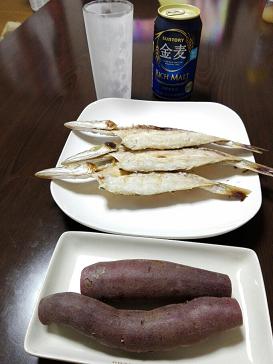 店長の帰宅後のお酒時間、つまみが干物と蒸かし芋だとは…私だったら干物だけにしておきます