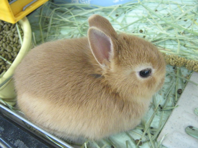 こちらはさっきのコと同じではありませんよ!こちらはドワーフラビットちゃんの女の子です。ミニウサギとの違いは小さいときはあまり大差ありませんが、成長するとミニウサギよりも身体っも小ぶりで、お耳も短めで、お顔もあまり長くなりません。