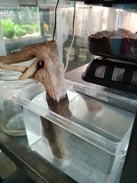 「おお!こいつ、ちゃんと飼ってトンボにしてやろうゼ!」とメガネ君と盛り上がり、プラケースを用意して、水を張って、いつ羽化したくなっても良いように、流木も入れてやりました。