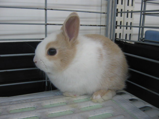最近紹介しましたオレンジのミニうさちゃんはお家が決まりましたので、今日は白×茶のミニウサギさんの女の子が新たにやってきました!