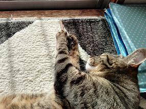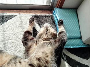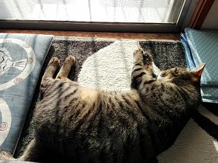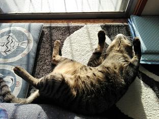 窓から差し込むお日様の光で暖まりながら寝ている、我が家の牡蠣(かき)くん。