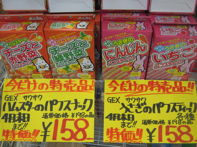 ですが、実はよく私達がレジでお配りしている白黒印刷のチラシ、知ってます?あちらは半月特売品なんです。4月15日までの特売品の内、小動物関連のものを、残業ついでに紹介しちゃいましょう!(もう、かなり空腹だが)