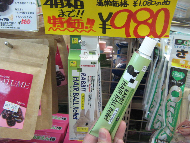 チューブタイプのウサギさん用毛球対策商品!!「ラビット・ヘアボールリリーフ」。毛づくろいで飲み込んでしまった被毛をうさぎさんは猫のように吐き出すことは出来ません。お腹の中で飲み込んだ被毛が毛球になってしまうと危険です。こちらを是非与えましょう! こちらを今回 特価!! ¥980!!