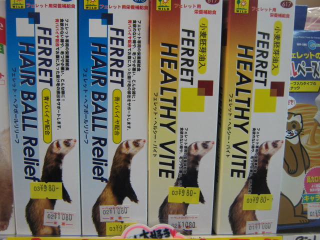 右の茶色い方は栄養補給用で「フェレット・ヘルシーバイト」。フェレットはお口から食べたものが、便になって出るまでなんと3時間と短時間!!その間にしっかり栄養を食べたものから吸収せねばならない訳です。だからこういった栄養補助食品が必要なんですね。 この2品も 特価!! ¥980!!