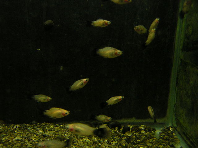 黄色地に黒が入るプラティなんです。いつだったかお休みの日にちょっと遠くの熱帯魚ショップを見に行って来た時、そこのショップで売っているのを見て、そのうちウチでも置こう!と思っていたプラティです。
