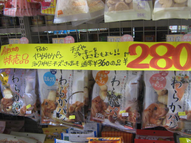人気の「やわらかパン」各種!! 特価!! ¥280!! 良く出来た時のご褒美に、小さくちぎって与えられるからいいですね!