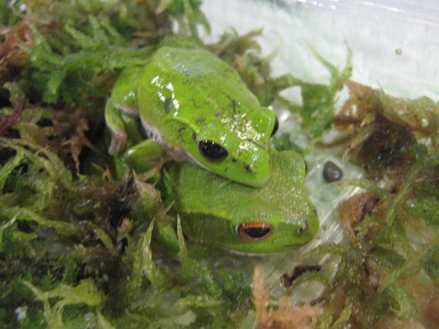 かわいいワンちゃんの次にコレというのも、いかがなものかとも思ったんですが、東北産「モリアオガエル」!! なんと!今回ペア!!で入荷です!! 下の大きいのがメスで上におんぶされてる小さいのがオスです。メスは滅多に入荷しません!