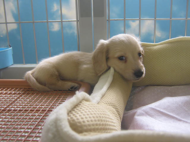 若干眠そうではありますが、ミニチュア・ダックス(ロングコート・男の子)!! 毛色はキレイなクリームです!