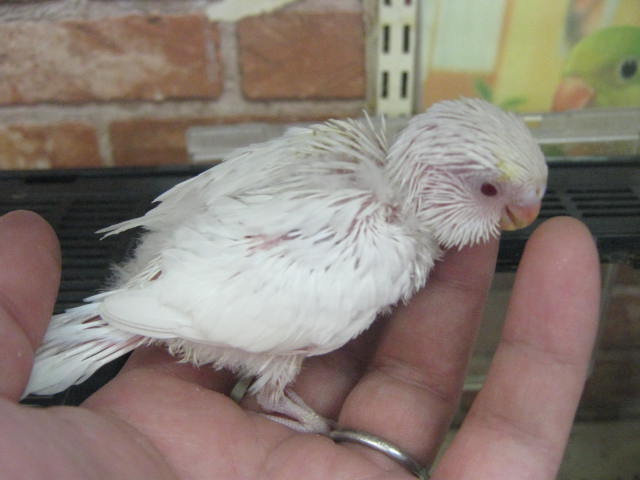 手乗りセキセイインコのヒナも数羽入荷しましたが、今回は「アルビノ」も混じっております!