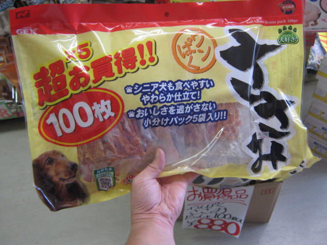 先日、あるお客様に「犬のおやつで安くて沢山入ってるやつは無いの?」と言われ、改めてそういう目でお店を見てみると、確かにあまり無い…!!