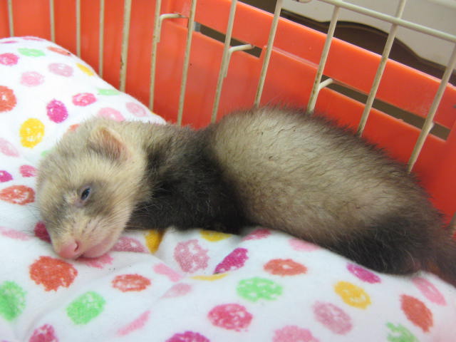 起こしちゃいけないから、少し小さな字で書きますが、このコも今朝私が本社から連れてきたパスバレーフェレットの男の子です。7月12日生まれです。 し