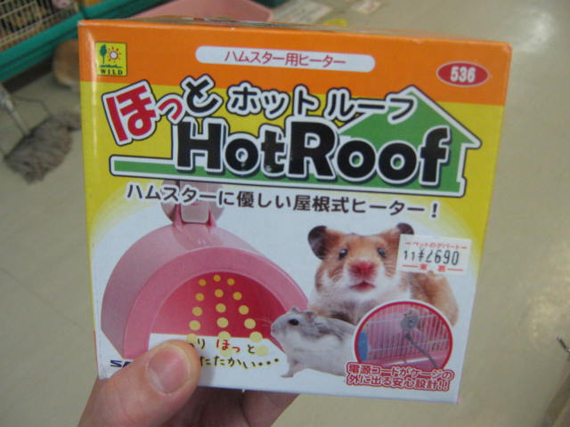 「ほっとホットルーフ」!! 従来のパネル型ヒーターと違って、熱源が上にあり、ハムちゃんの身体に直接触れないので、より安心