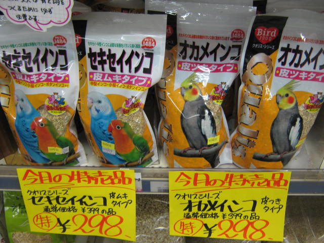 セキセイインコ(皮ムキタイプ)とオカメインコ(皮付きタイプ)どちらも特価!! ¥298!!