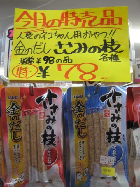 こちらはネコちゃん用おやつ。 人気商品「ささみの枝」!人気があるということは、ネコちゃんが喜んで食べるのでしょう。 特価!! ¥78!!
