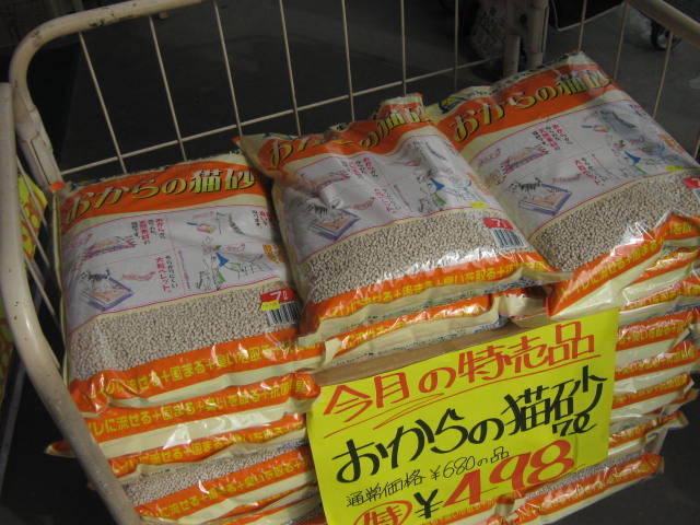 おからの猫砂 特価!! ¥498!! トイレにも流せます。トイレに流せるってこんなにラクなもんかと、ごく最近私知りました