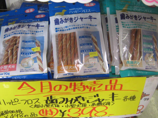 ワンちゃん用の歯磨きジャーキー! 歯磨きガムってのは色々ありますが、「ジャーキー」ってあんまり無いでしょ? 各種 特価!! ¥398!!