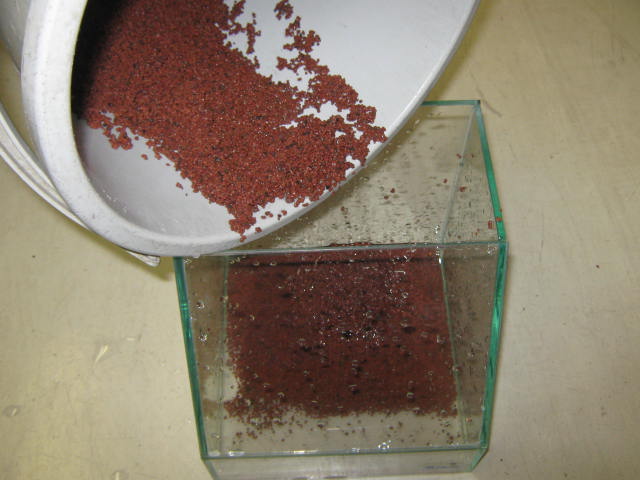 まず、水槽を軽く水洗いしたあと溶岩砂をよ~く洗い、水槽に敷きます。