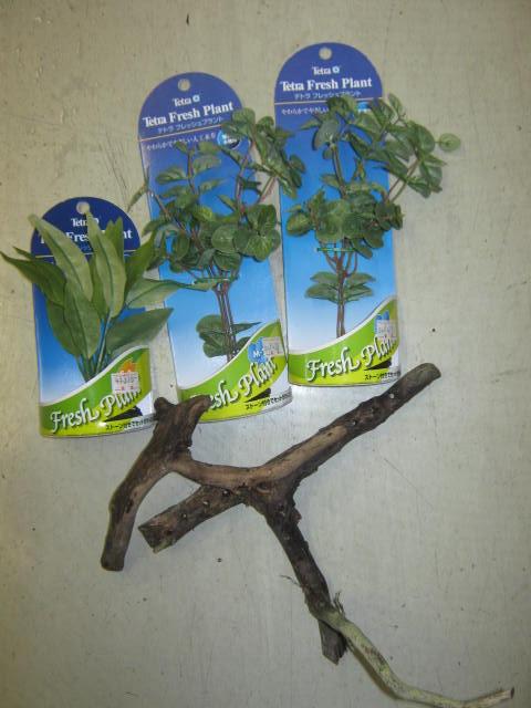 今回は本物の水草ではなく、人工水草を使うことにします。それとお魚コーナーに転がってた枝流木も入れてみます。