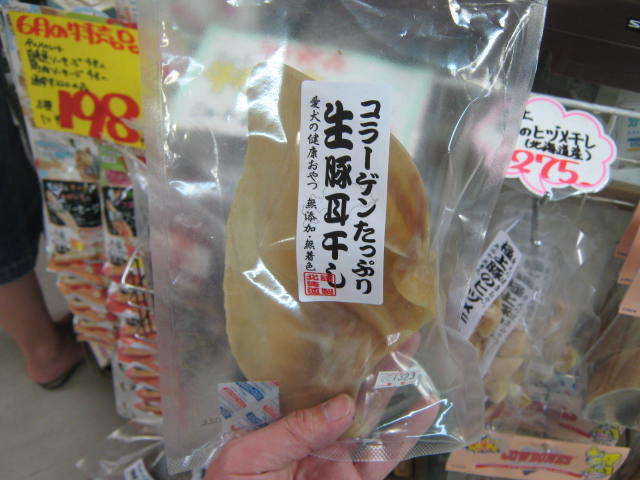 「北海道産 コラーゲンたっぷり 生豚耳干し」!! 「生」と書いてあるので、くにゃくにゃしたお耳が届いたらどうしよう…と若干ビクビクしておりましたが、干してあるのでくにゃくにゃではなく、ひと安心
